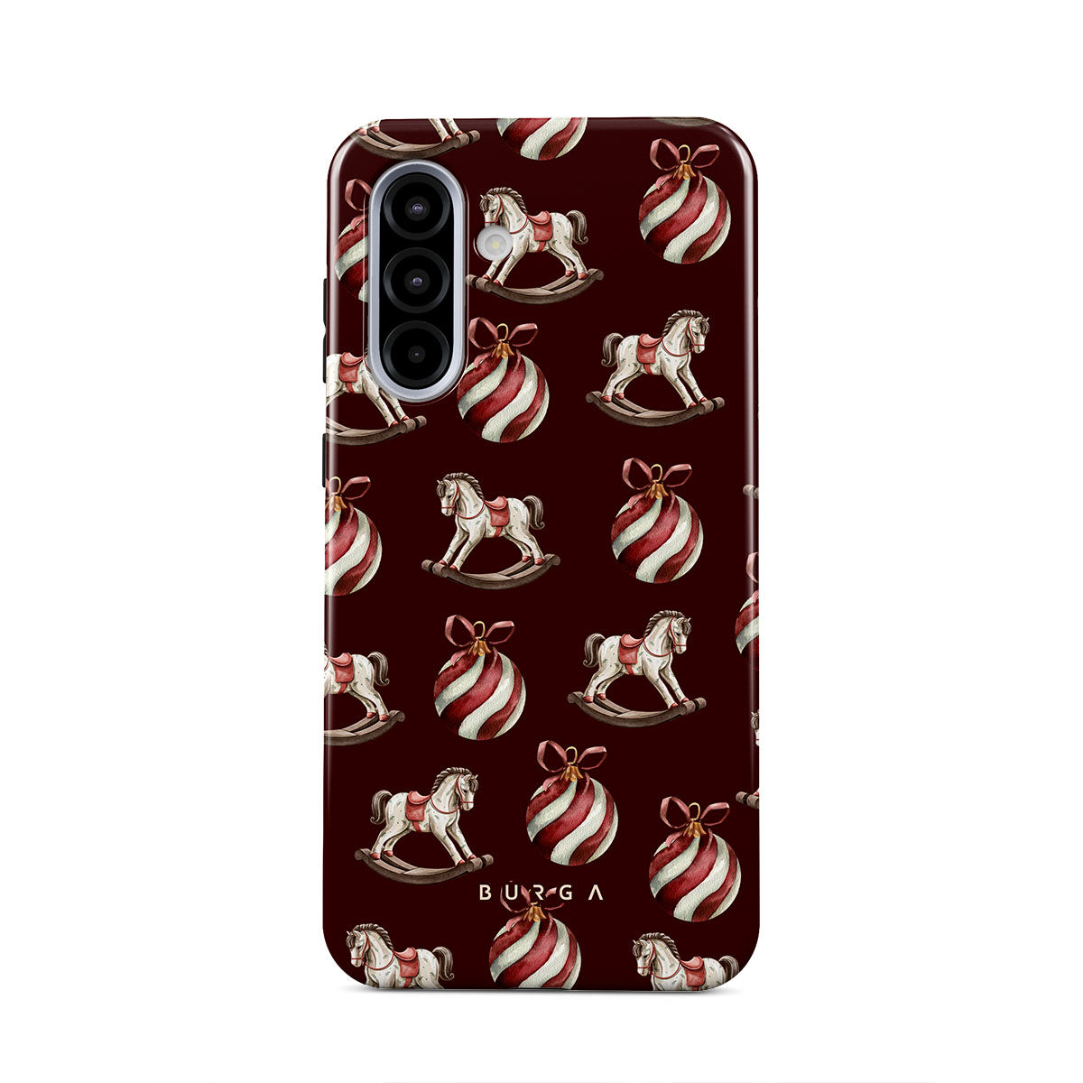 El diseño presenta: caballitos balancín, bolas de Navidad, rojo, decoración navideña