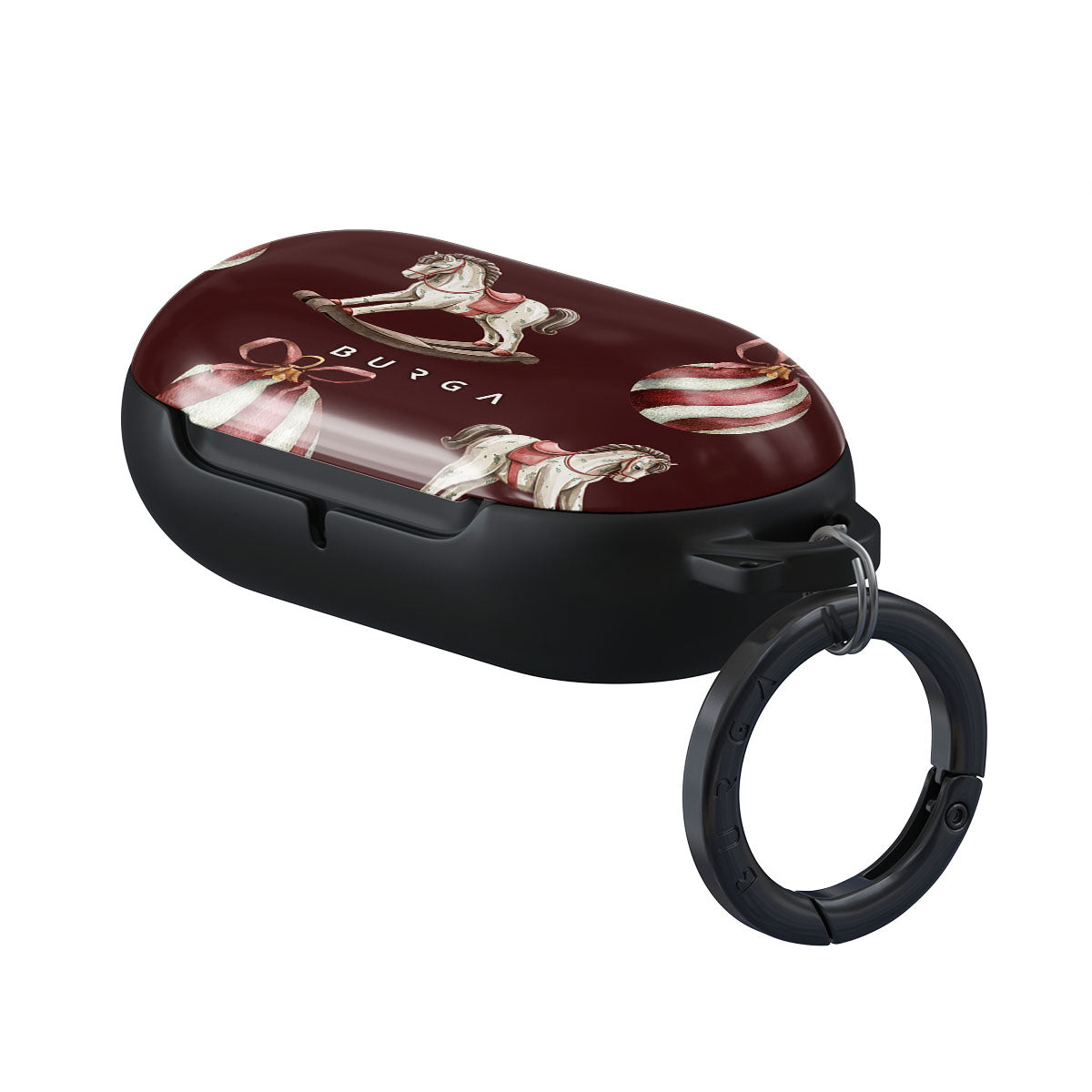 El diseño presenta: caballitos balancín, bolas de Navidad, rojo, decoración navideña