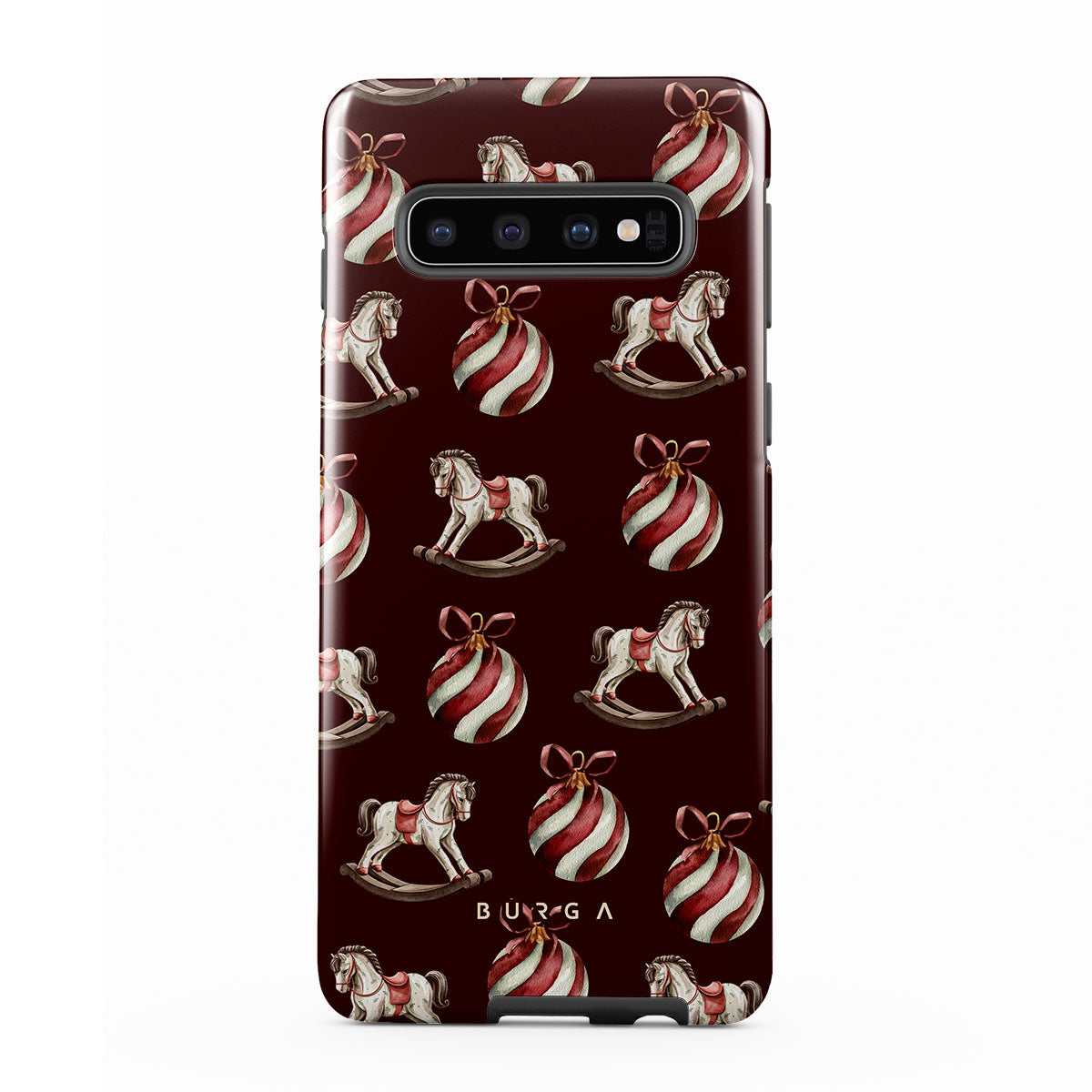 El diseño presenta: caballitos balancín, bolas de Navidad, rojo, decoración navideña