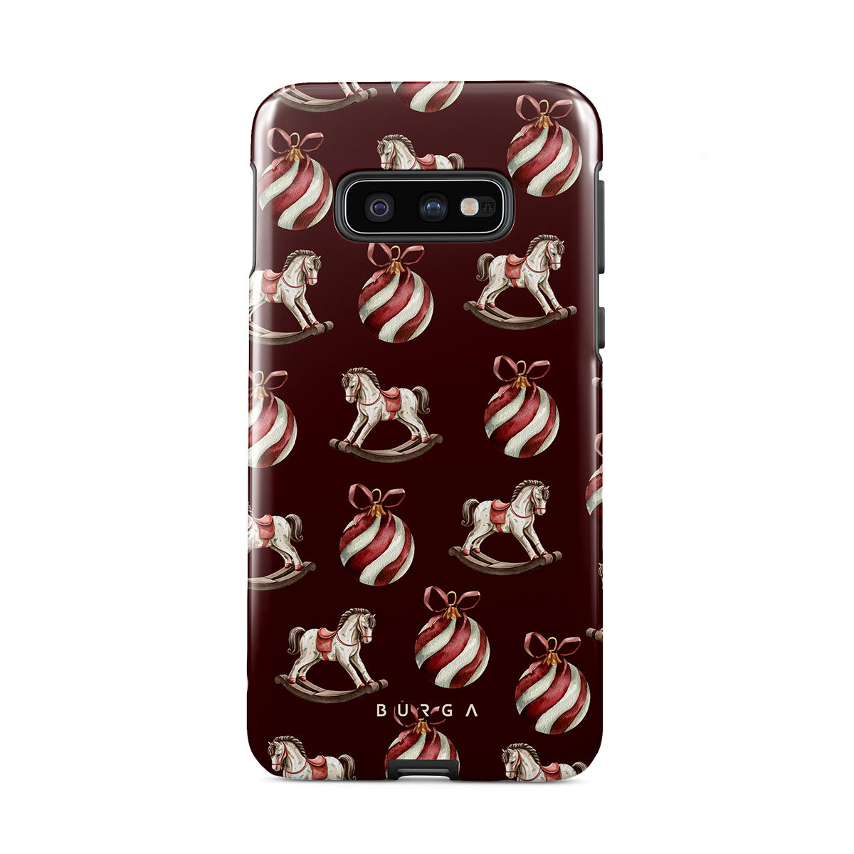 El diseño presenta: caballitos balancín, bolas de Navidad, rojo, decoración navideña