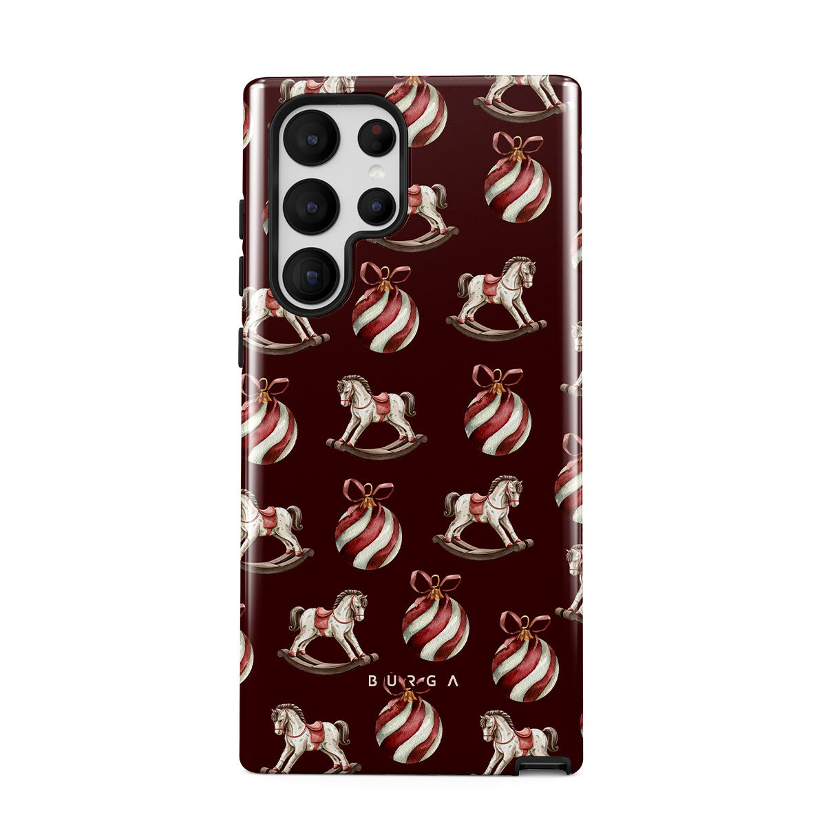 El diseño presenta: caballitos balancín, bolas de Navidad, rojo, decoración navideña