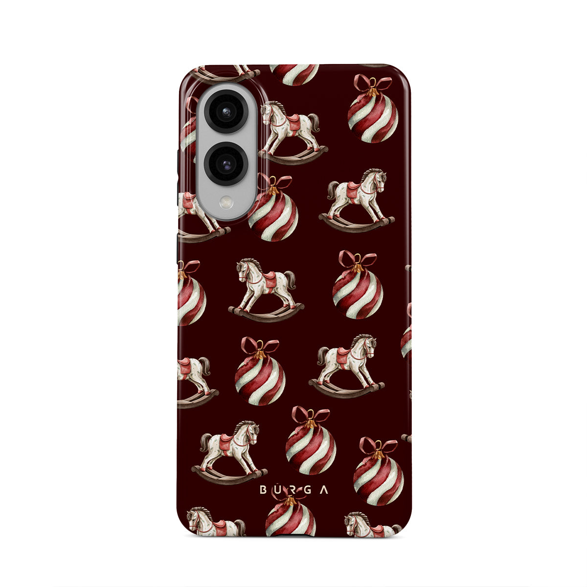 El diseño presenta: caballitos balancín, bolas de Navidad, rojo, decoración navideña