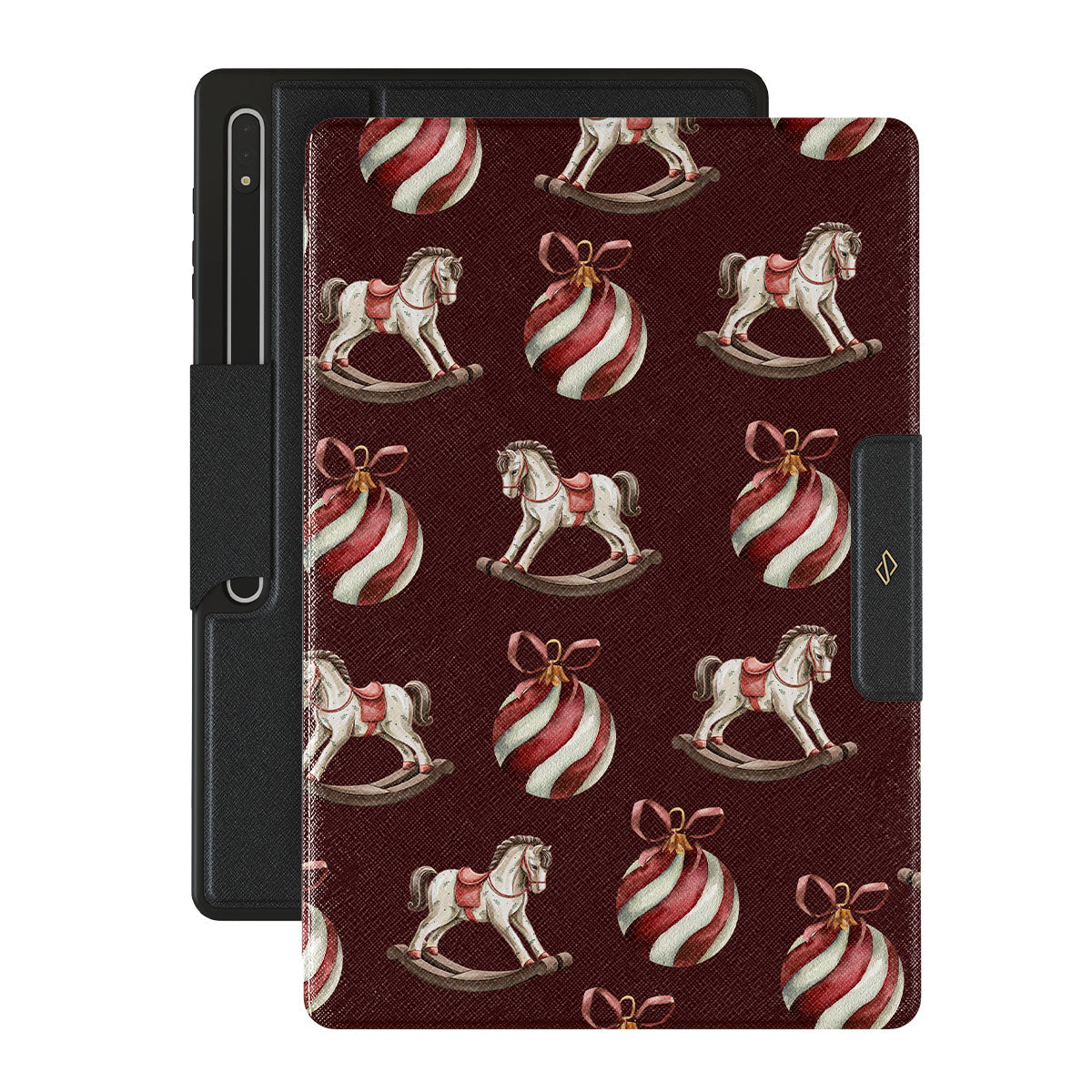 El diseño presenta: caballitos balancín, bolas de Navidad, rojo, decoración navideña