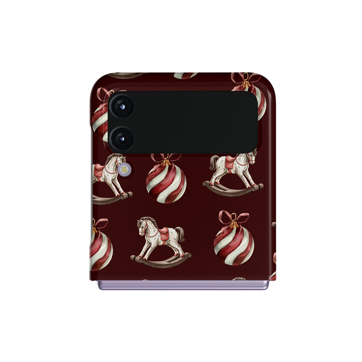 El diseño presenta: caballitos balancín, bolas de Navidad, rojo, decoración navideña