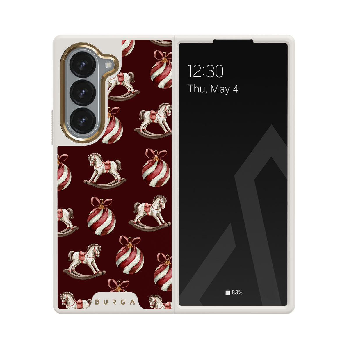 El diseño presenta: caballitos balancín, bolas de Navidad, rojo, decoración navideña