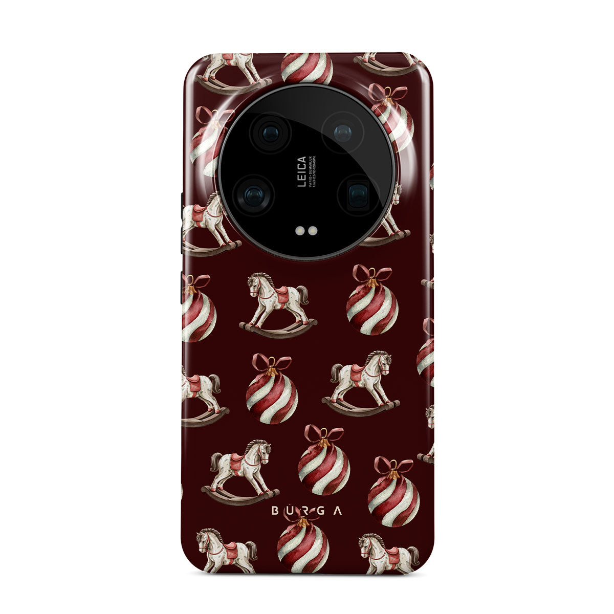 El diseño presenta: caballitos balancín, bolas de Navidad, rojo, decoración navideña