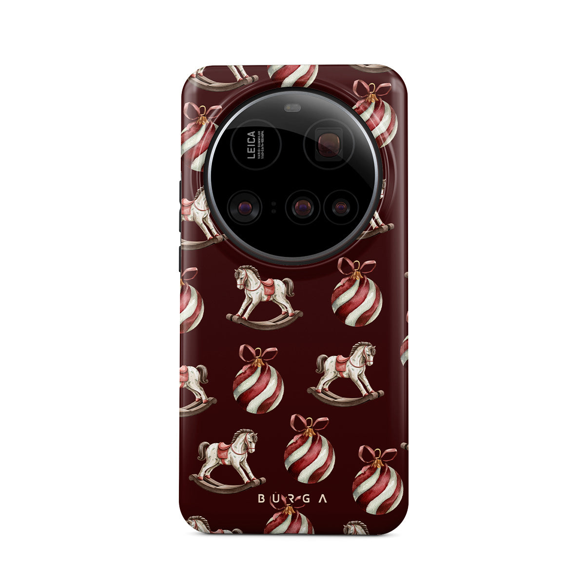 El diseño presenta: caballitos balancín, bolas de Navidad, rojo, decoración navideña