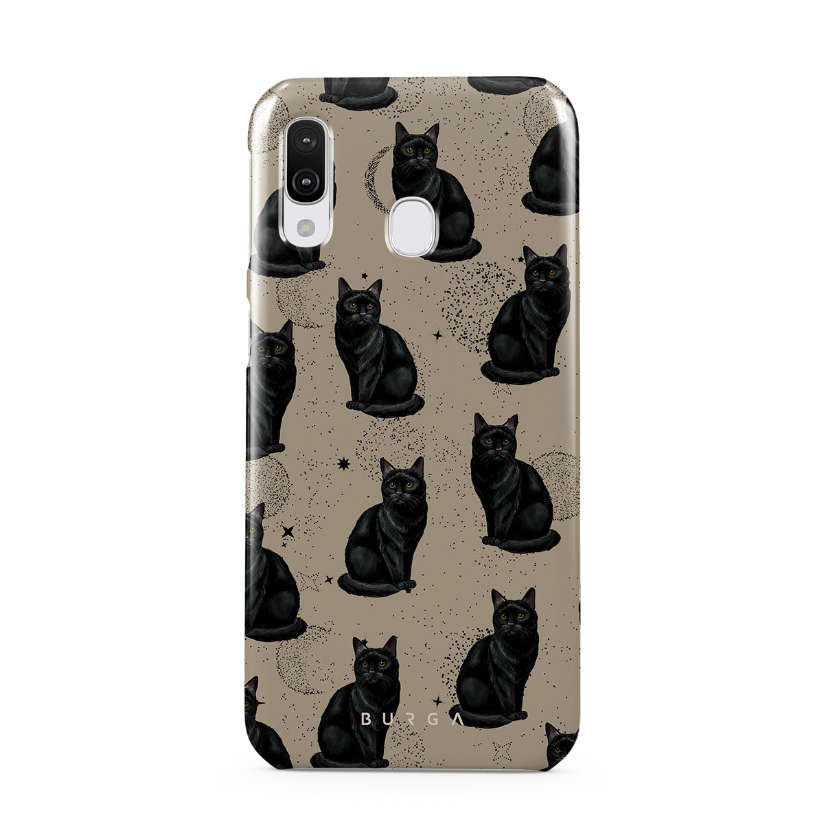 En este diseño: gatos negros, símbolos místicos.