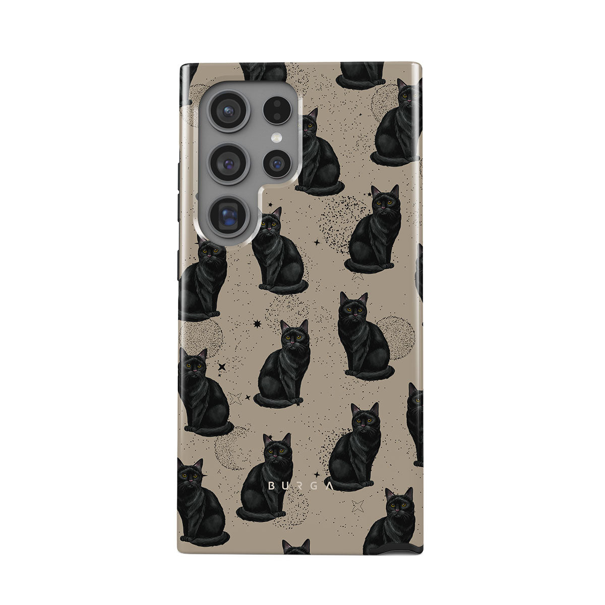 En este diseño: gatos negros, símbolos místicos.