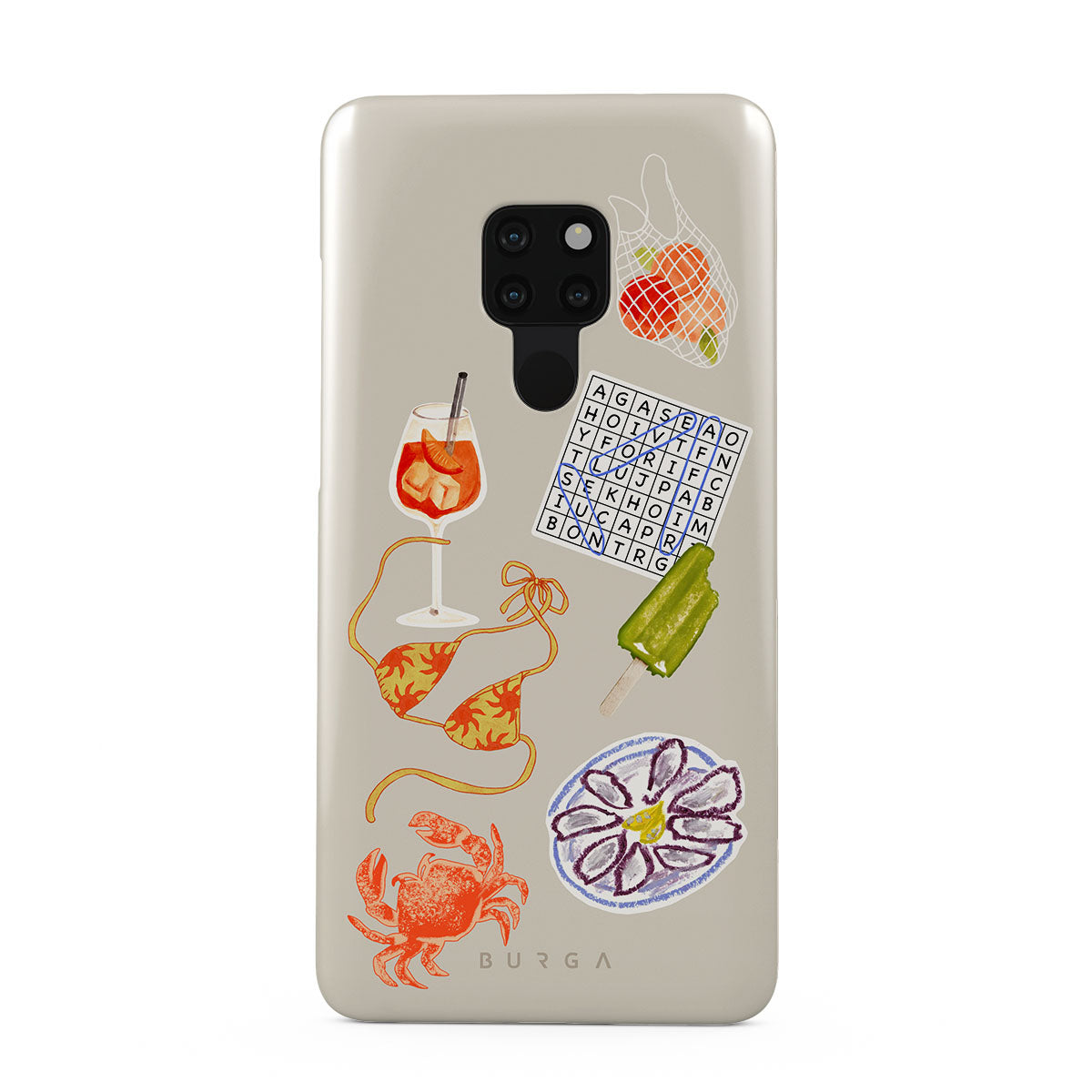 En este diseño: cangrejo, plato de ostras, paleta helada, crucigrama, cóctel spritz, top de bikini, frutas.