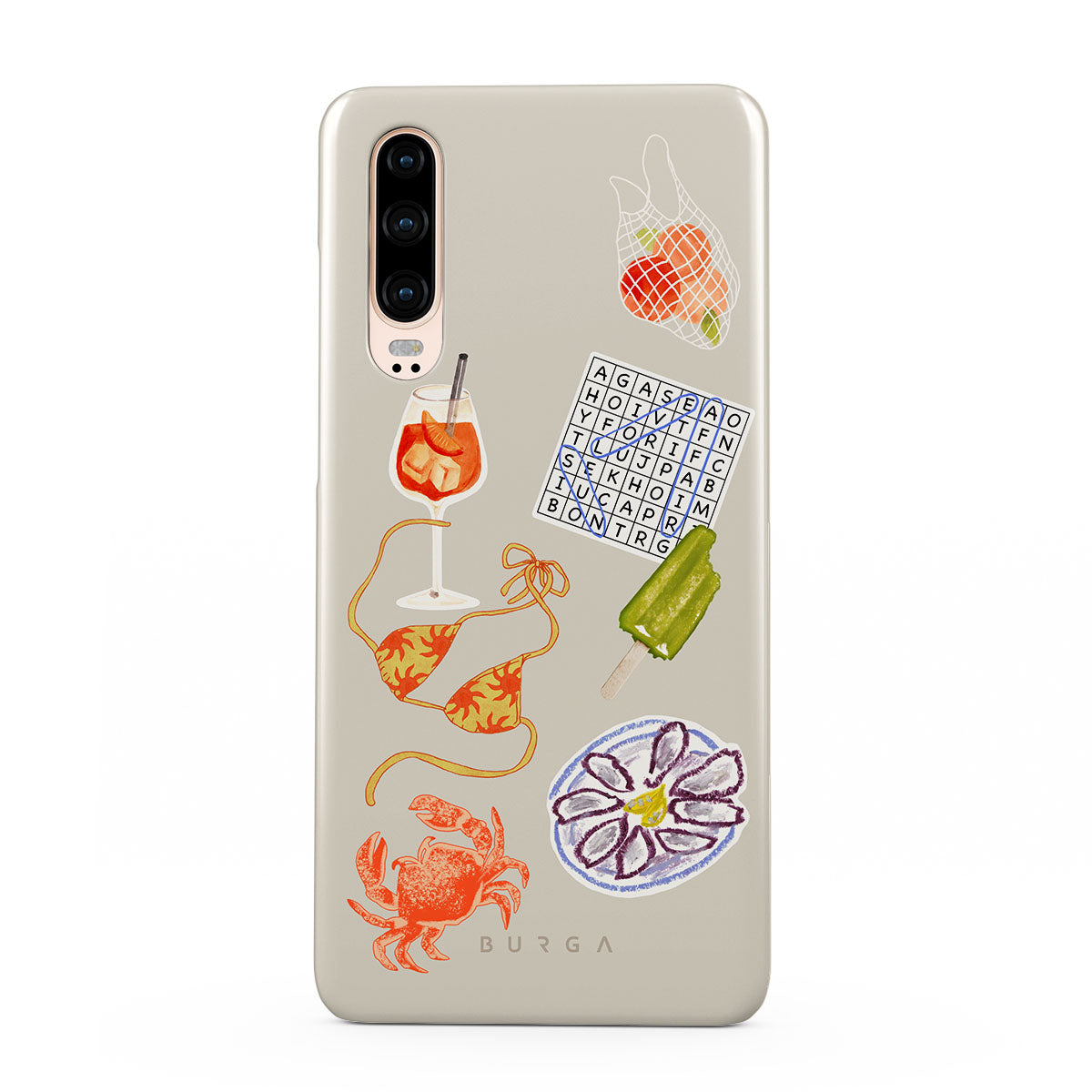 En este diseño: cangrejo, plato de ostras, paleta helada, crucigrama, cóctel spritz, top de bikini, frutas.