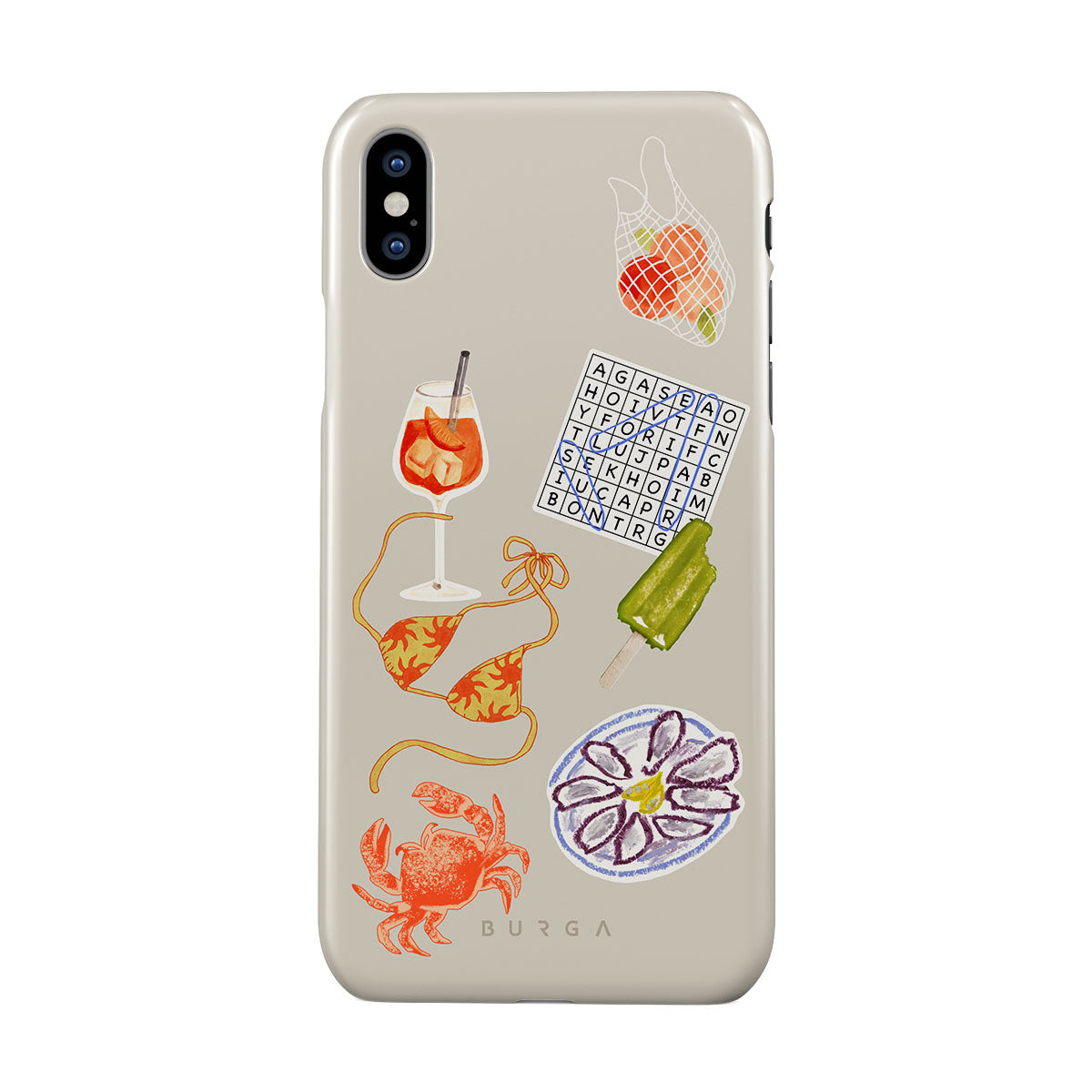 En este diseño: cangrejo, plato de ostras, paleta helada, crucigrama, cóctel spritz, top de bikini, frutas.