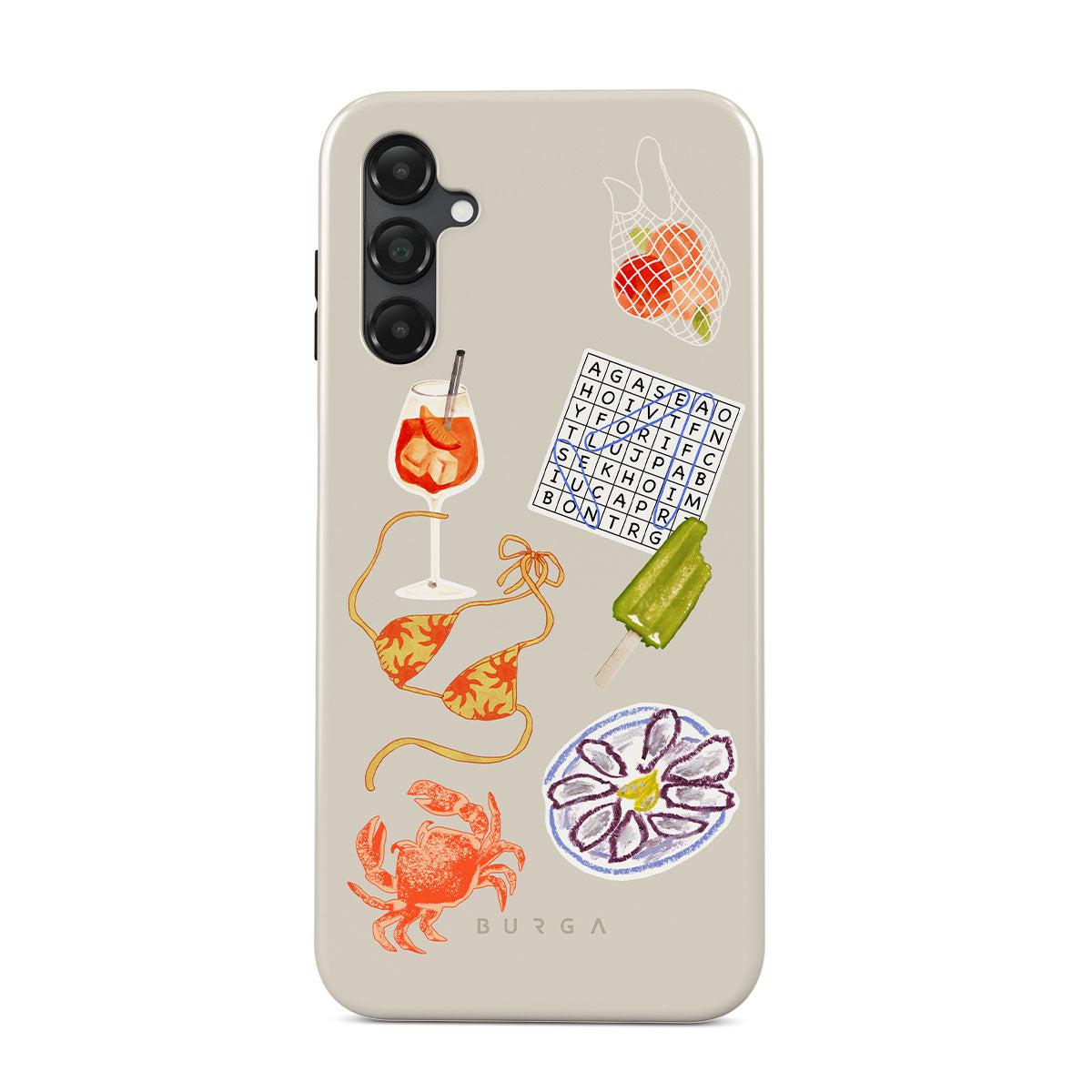 En este diseño: cangrejo, plato de ostras, paleta helada, crucigrama, cóctel spritz, top de bikini, frutas.
