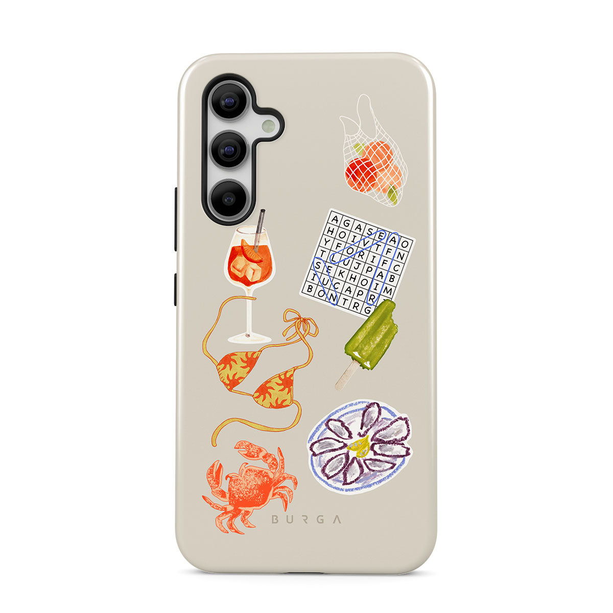 En este diseño: cangrejo, plato de ostras, paleta helada, crucigrama, cóctel spritz, top de bikini, frutas.