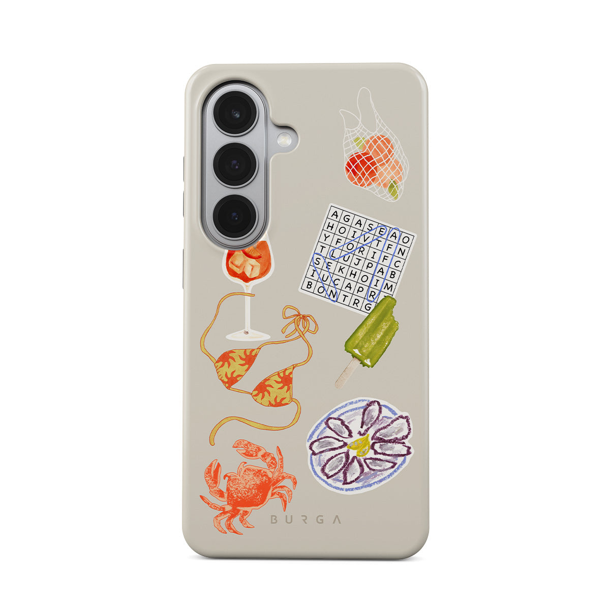 En este diseño: cangrejo, plato de ostras, paleta helada, crucigrama, cóctel spritz, top de bikini, frutas.