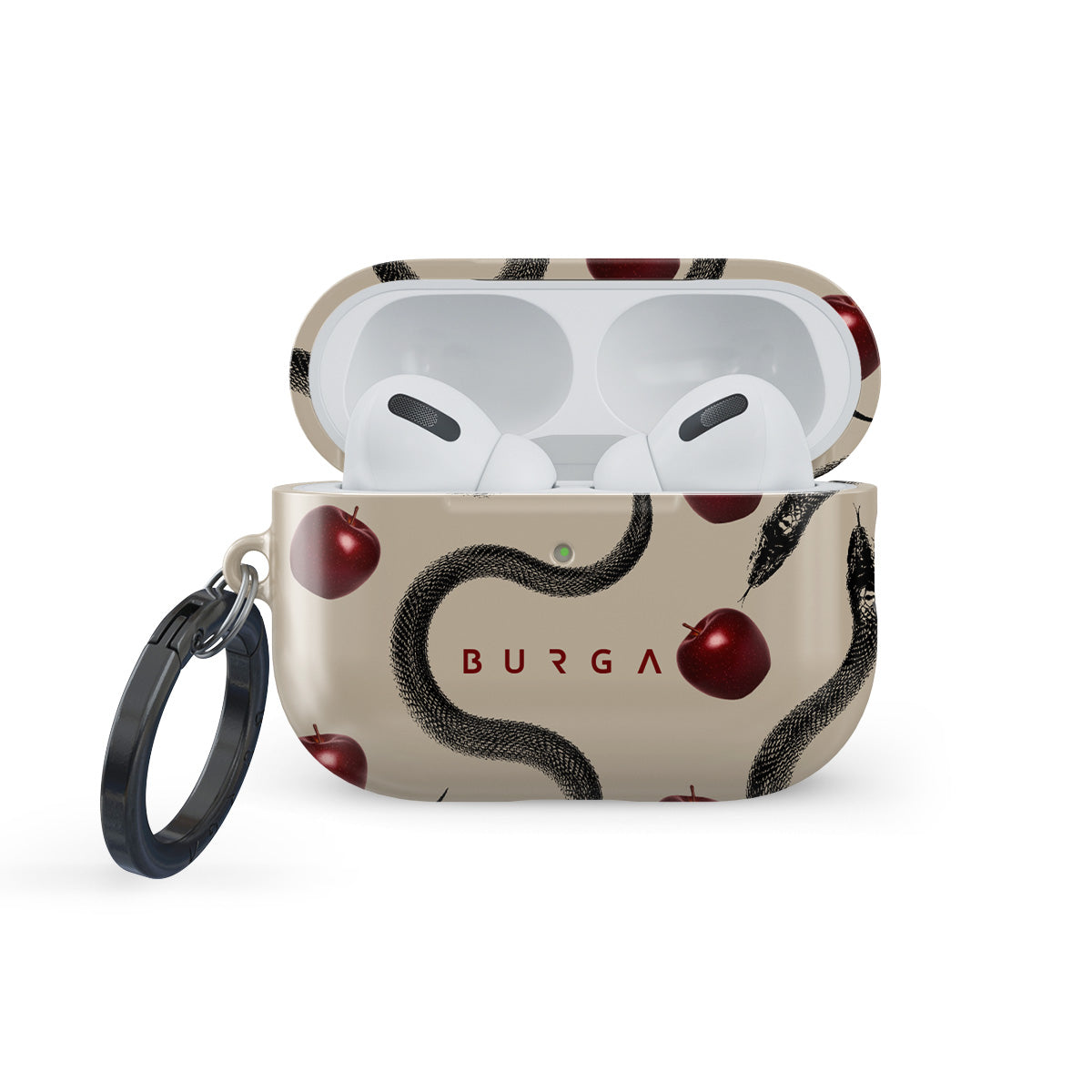 En este diseño: manzanas rojas brillantes, serpientes enroscadas y tonos beis.