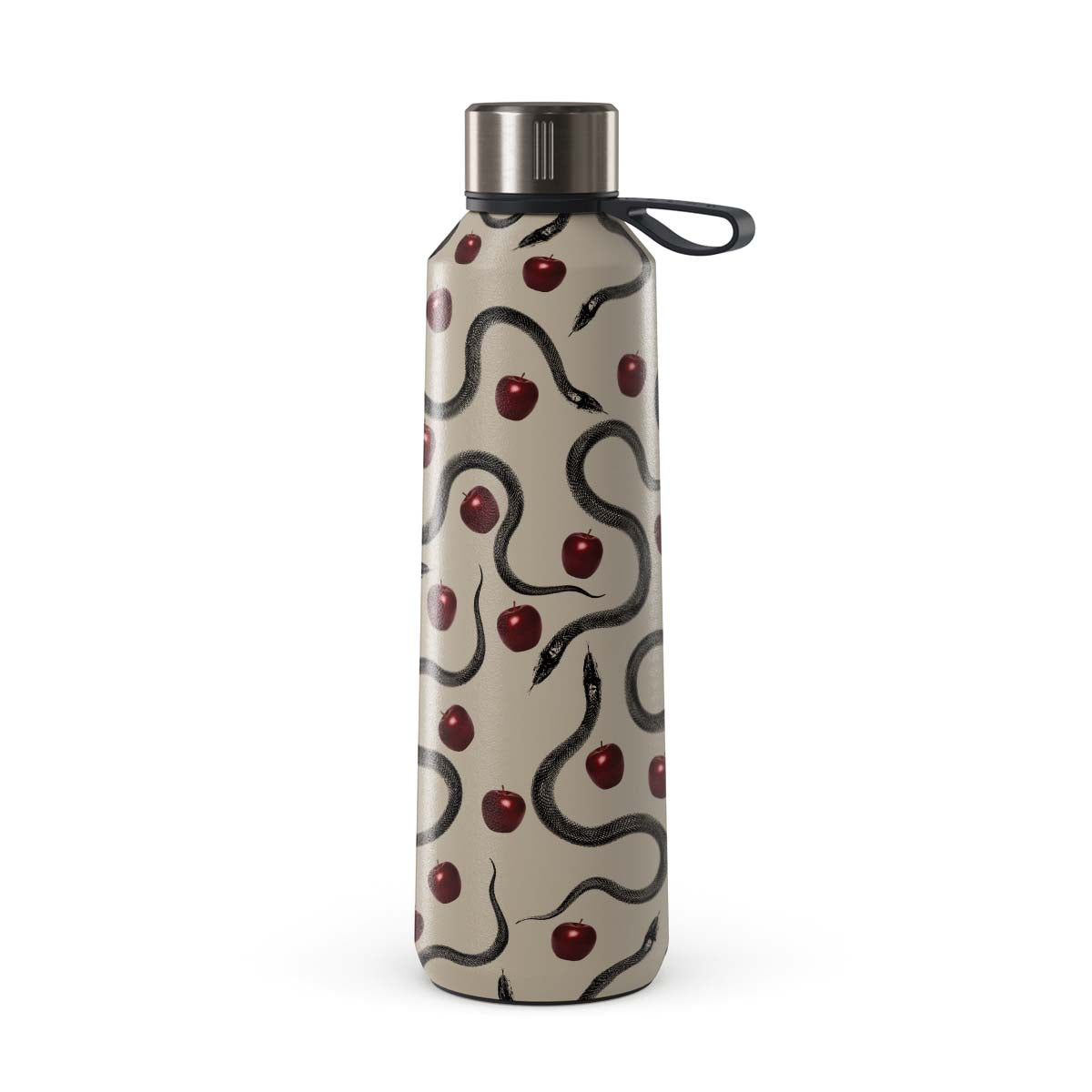 En este diseño: manzanas rojas brillantes, serpientes enroscadas y tonos beis.