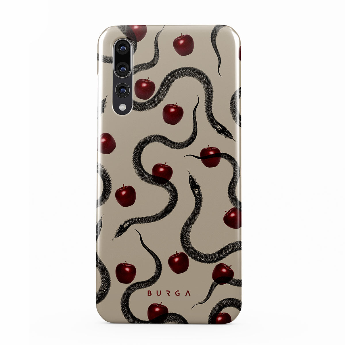 En este diseño: manzanas rojas brillantes, serpientes enroscadas y tonos beis.