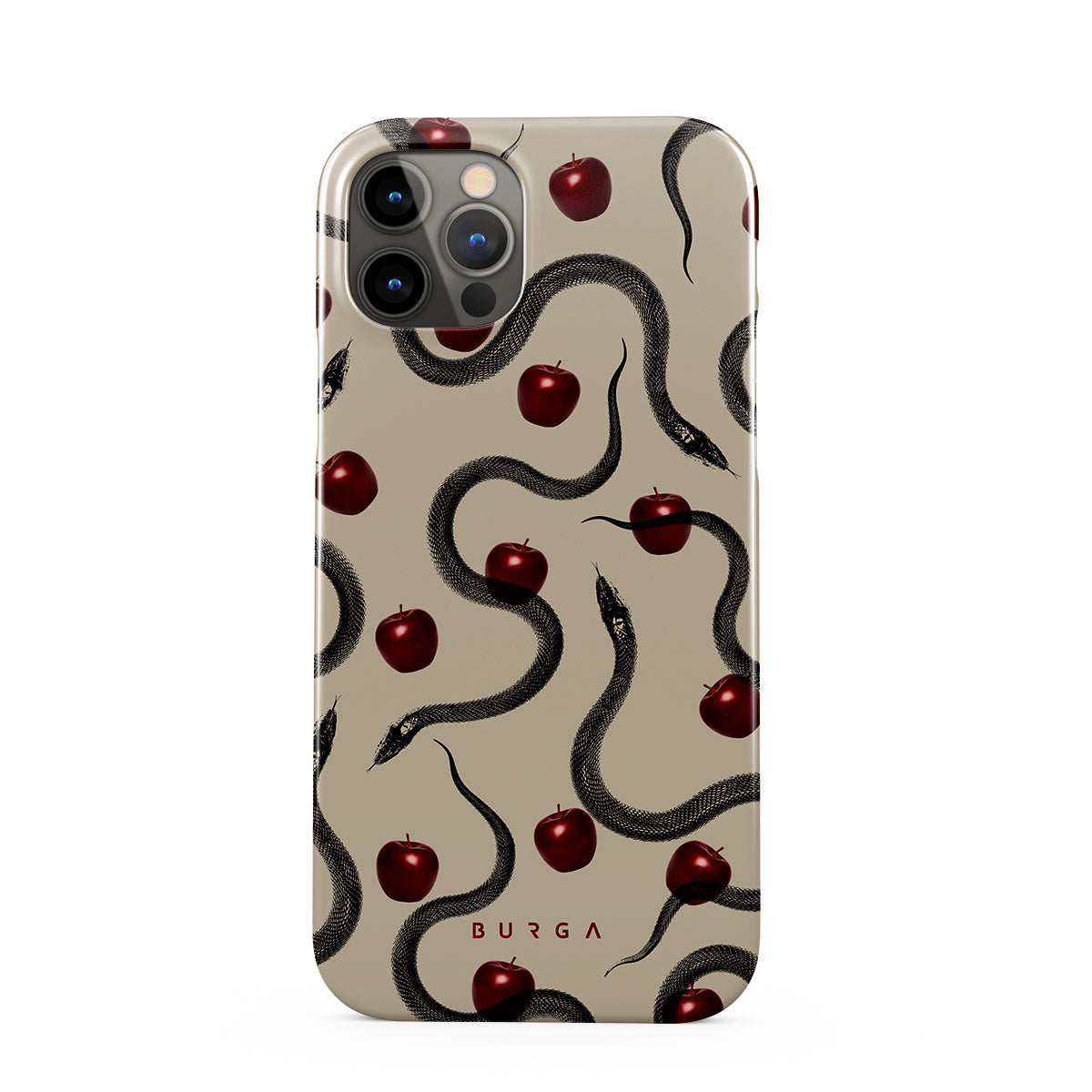 En este diseño: manzanas rojas brillantes, serpientes enroscadas y tonos beis.