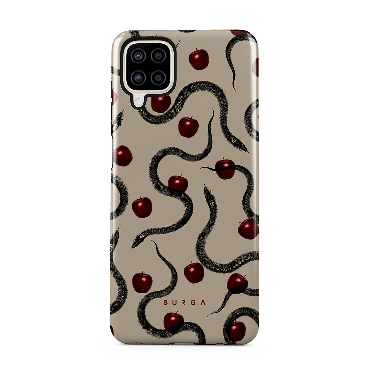 En este diseño: manzanas rojas brillantes, serpientes enroscadas y tonos beis.