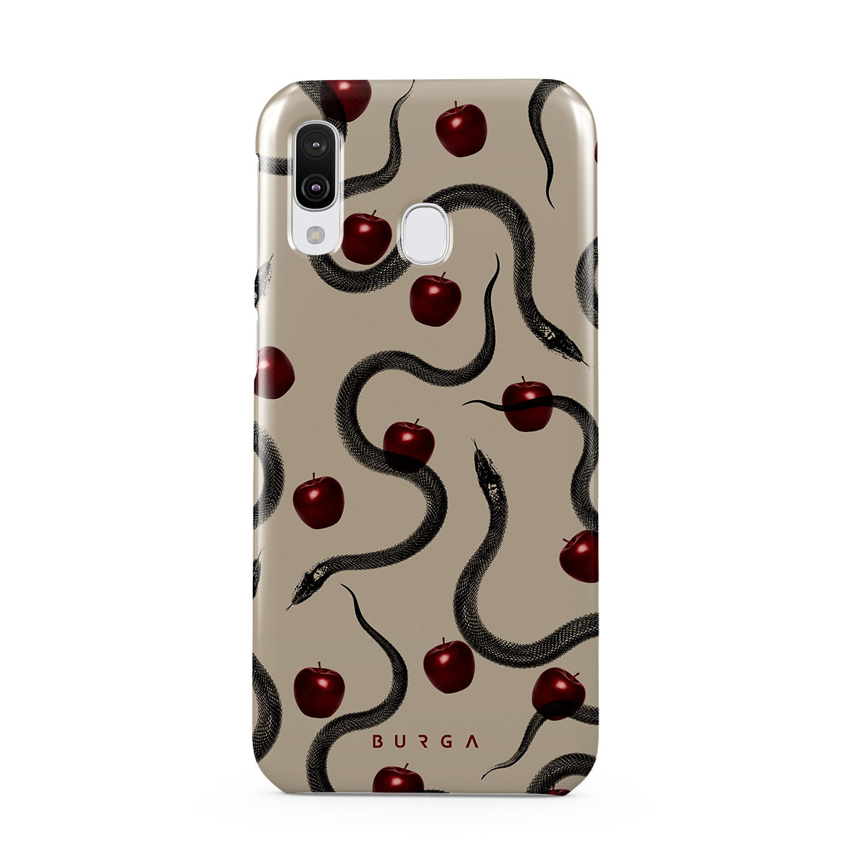 En este diseño: manzanas rojas brillantes, serpientes enroscadas y tonos beis.