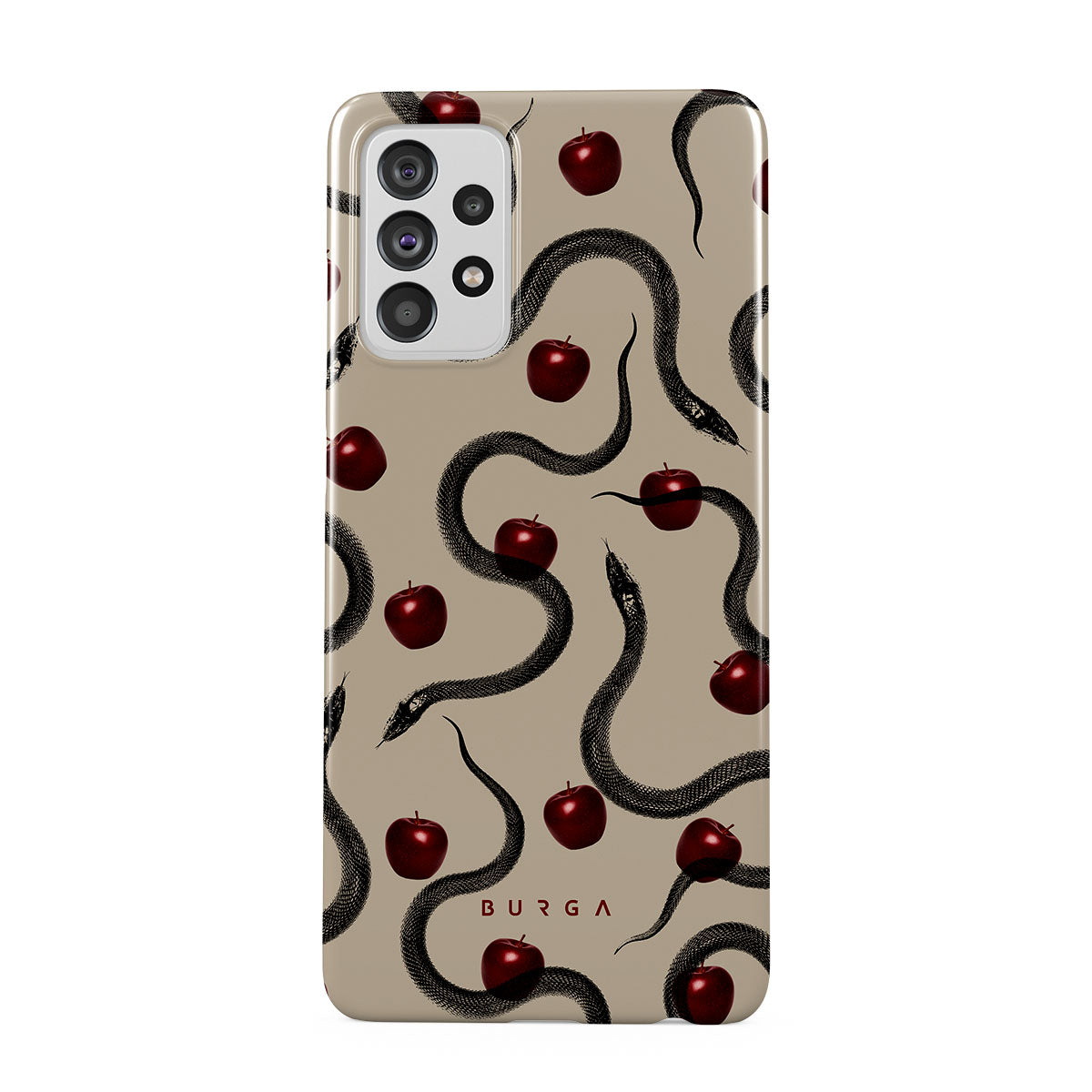 En este diseño: manzanas rojas brillantes, serpientes enroscadas y tonos beis.