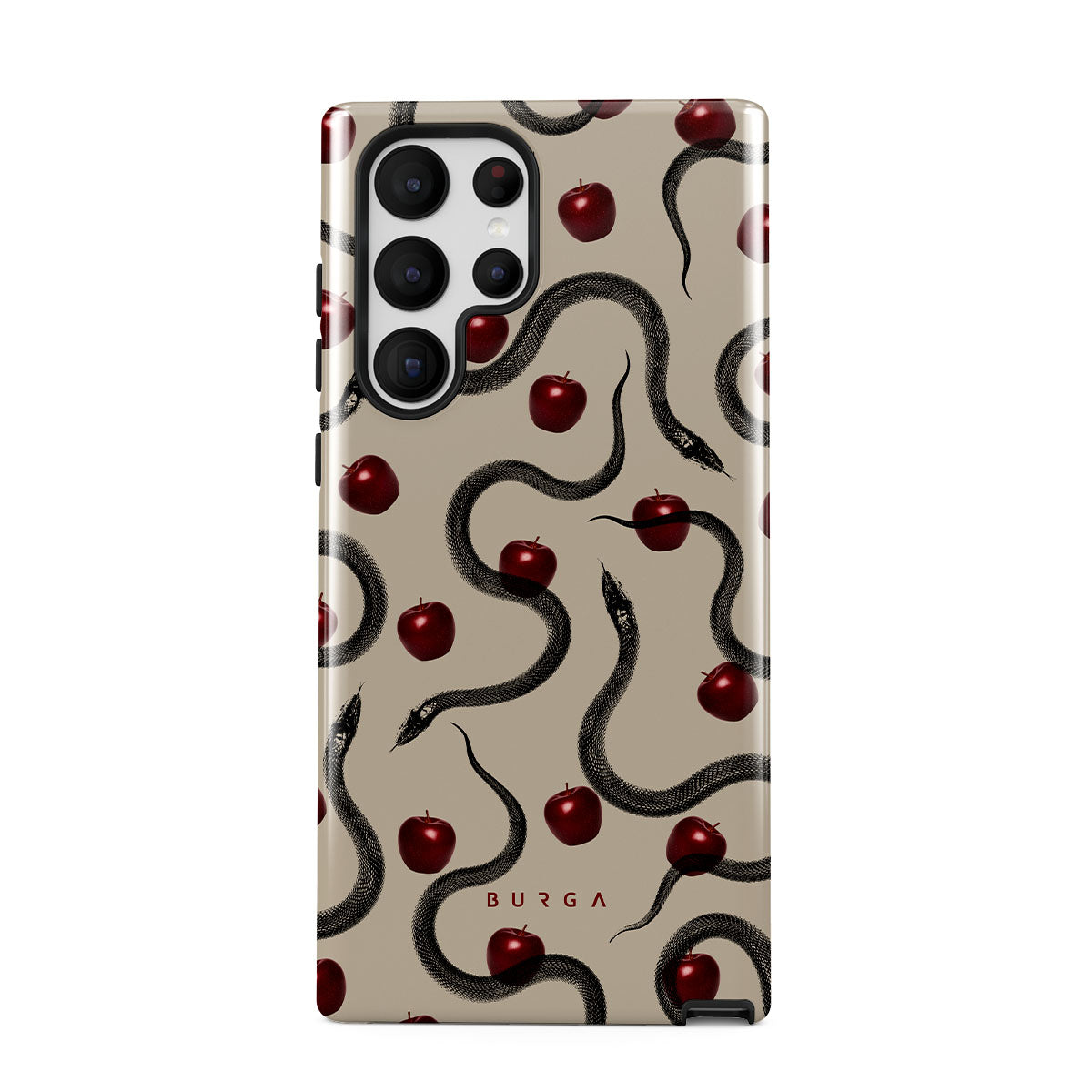 En este diseño: manzanas rojas brillantes, serpientes enroscadas y tonos beis.