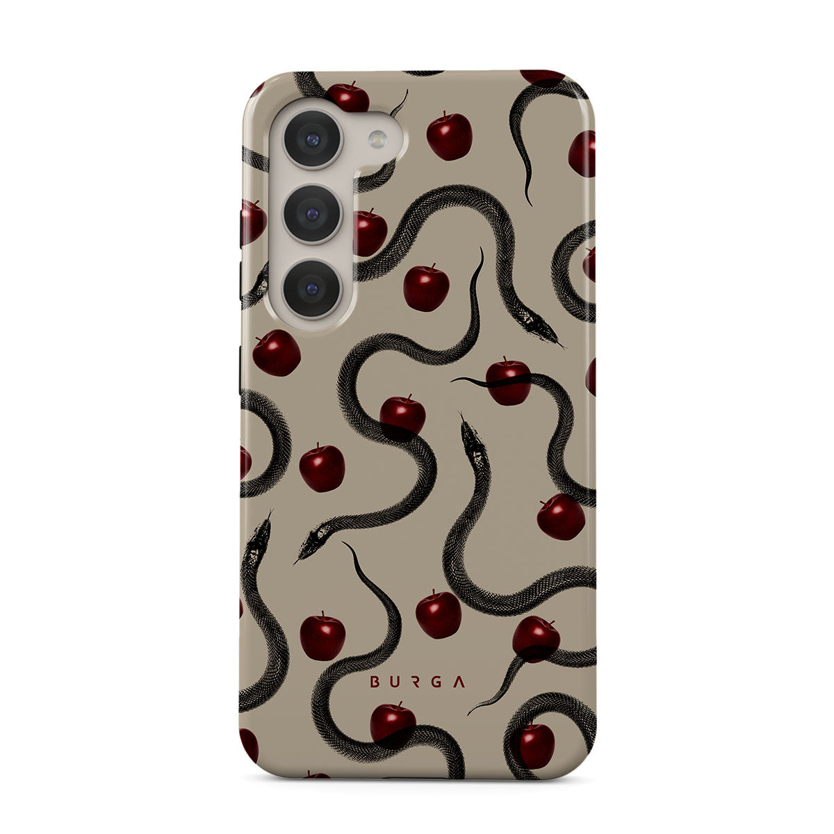 En este diseño: manzanas rojas brillantes, serpientes enroscadas y tonos beis.