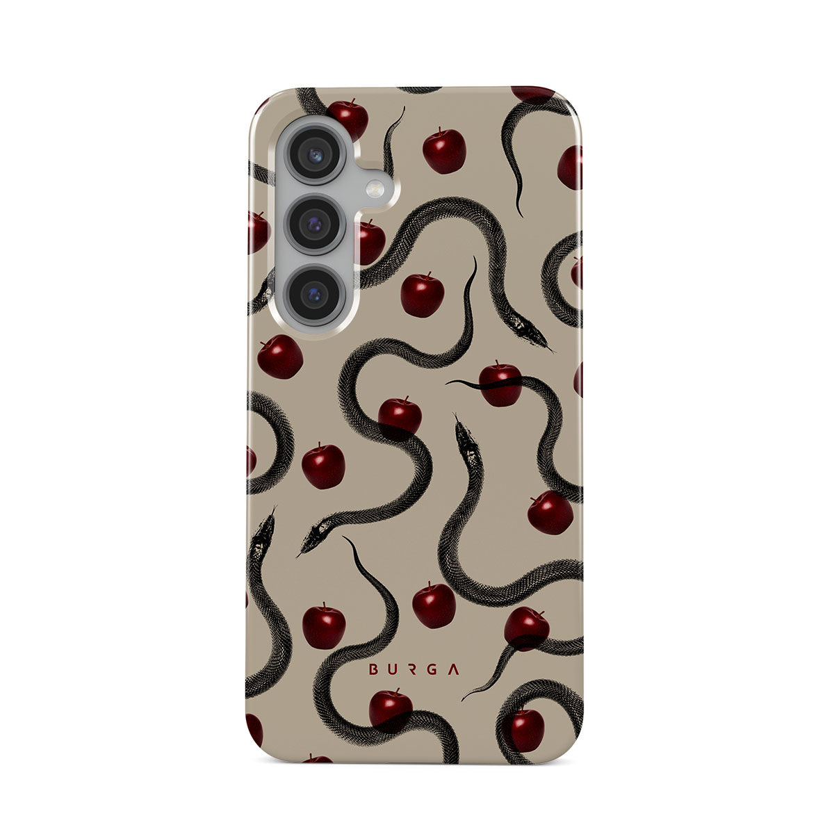En este diseño: manzanas rojas brillantes, serpientes enroscadas y tonos beis.