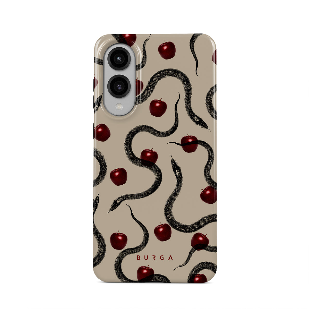 En este diseño: manzanas rojas brillantes, serpientes enroscadas y tonos beis.