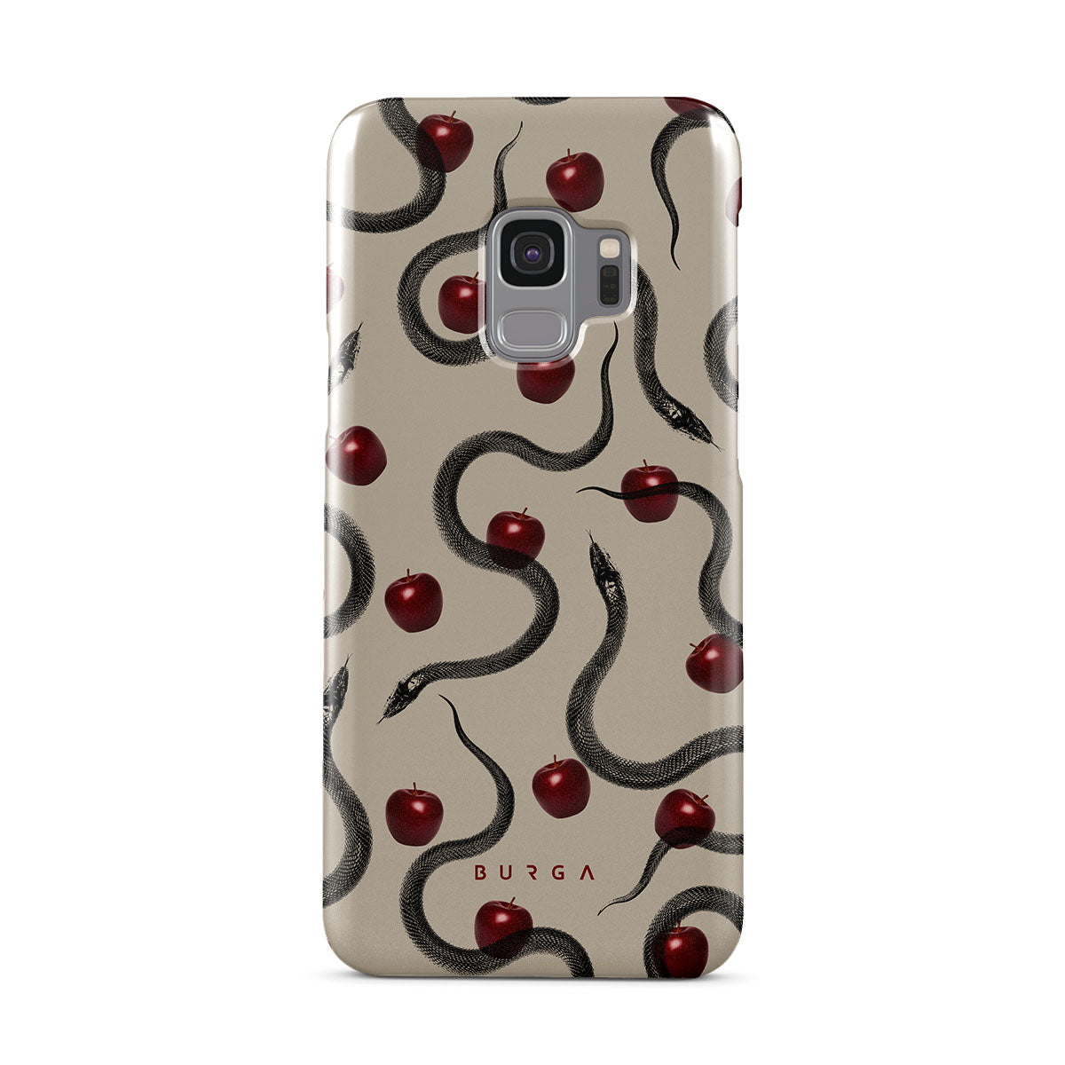 En este diseño: manzanas rojas brillantes, serpientes enroscadas y tonos beis.