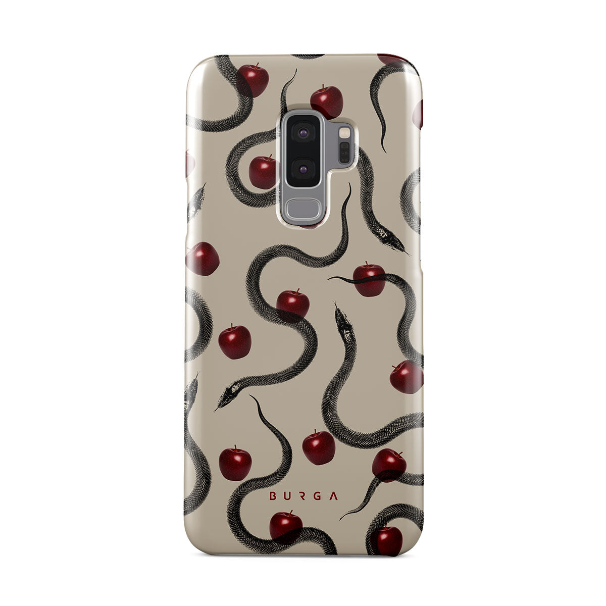En este diseño: manzanas rojas brillantes, serpientes enroscadas y tonos beis.