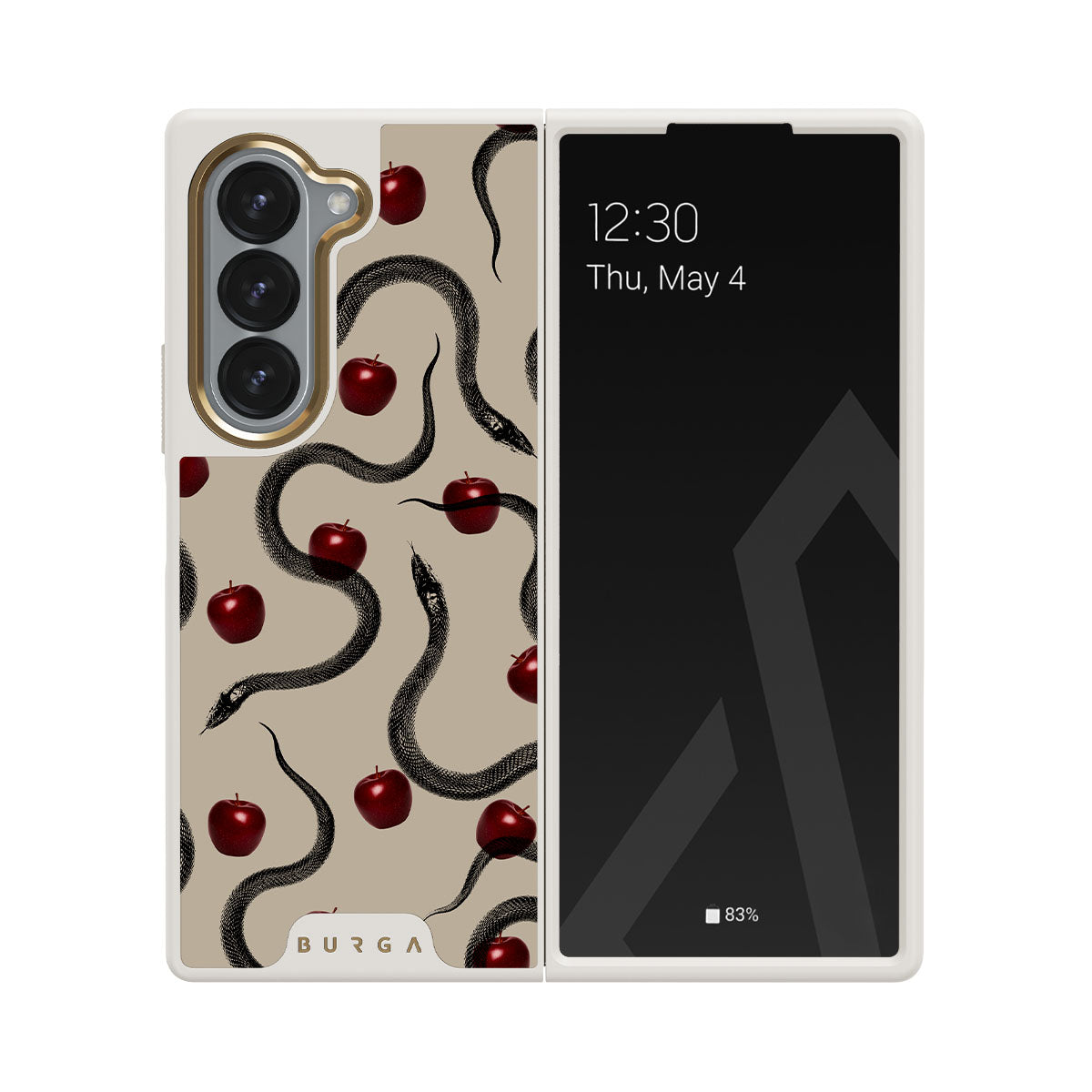 En este diseño: manzanas rojas brillantes, serpientes enroscadas y tonos beis.