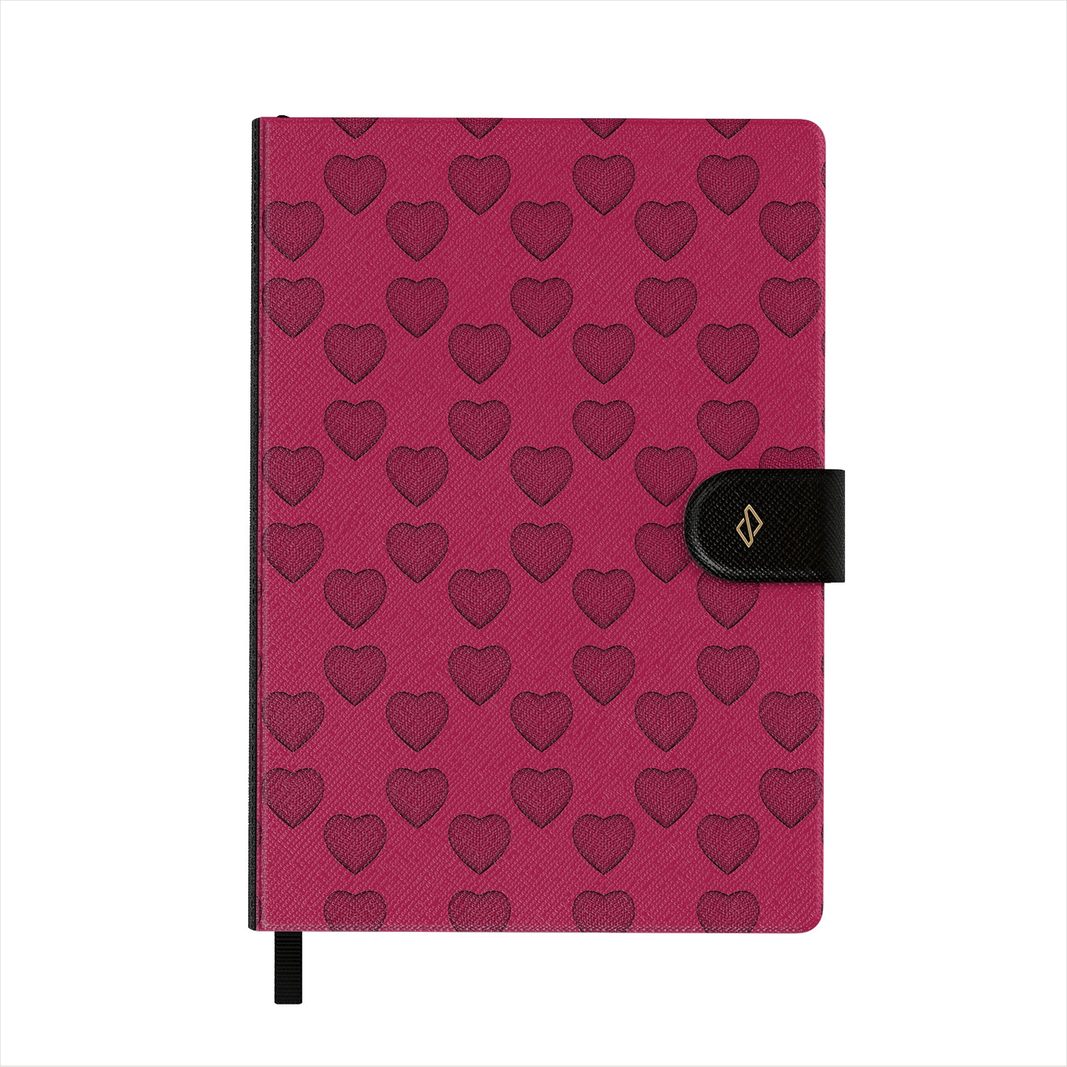 La portada está decorada con los diseños de BURGA impresos en piel sintética vegana. Incluye una elegante cinta negra marcapáginas.