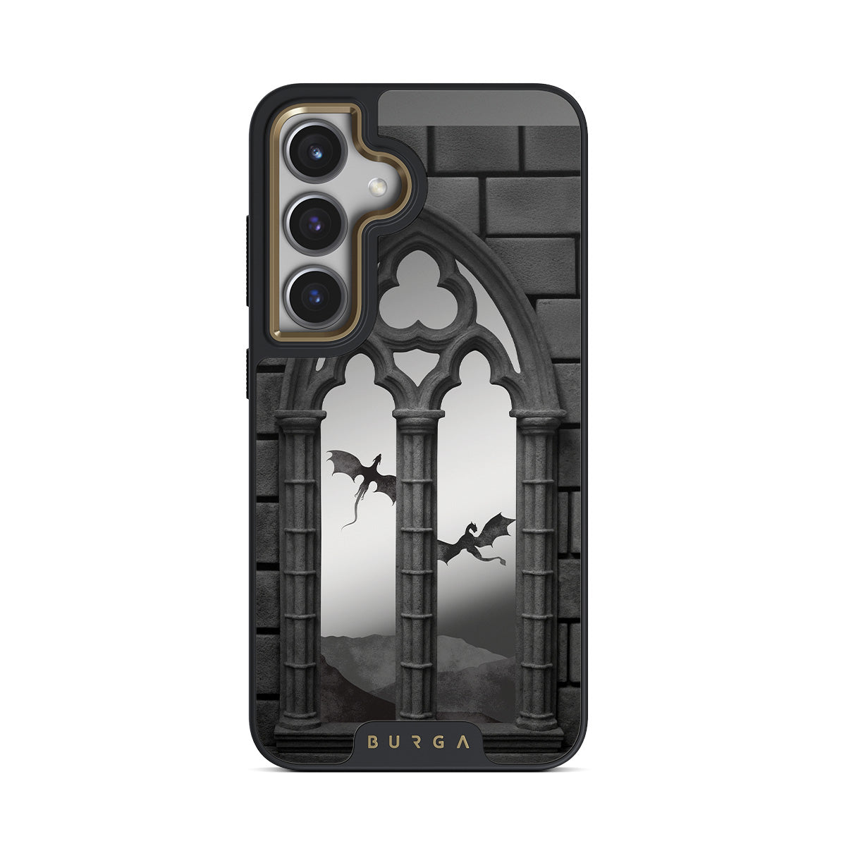 En este diseño: arcos góticos, dragones voladores, criaturas místicas, inserción de espejo