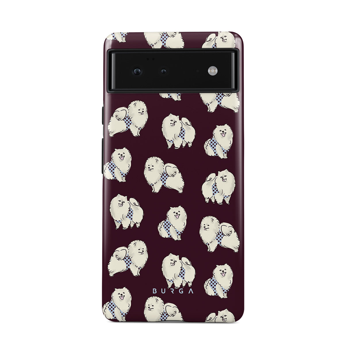En este diseño: perros blancos y esponjosos, fondo burdeos oscuro, caniches, mascotas