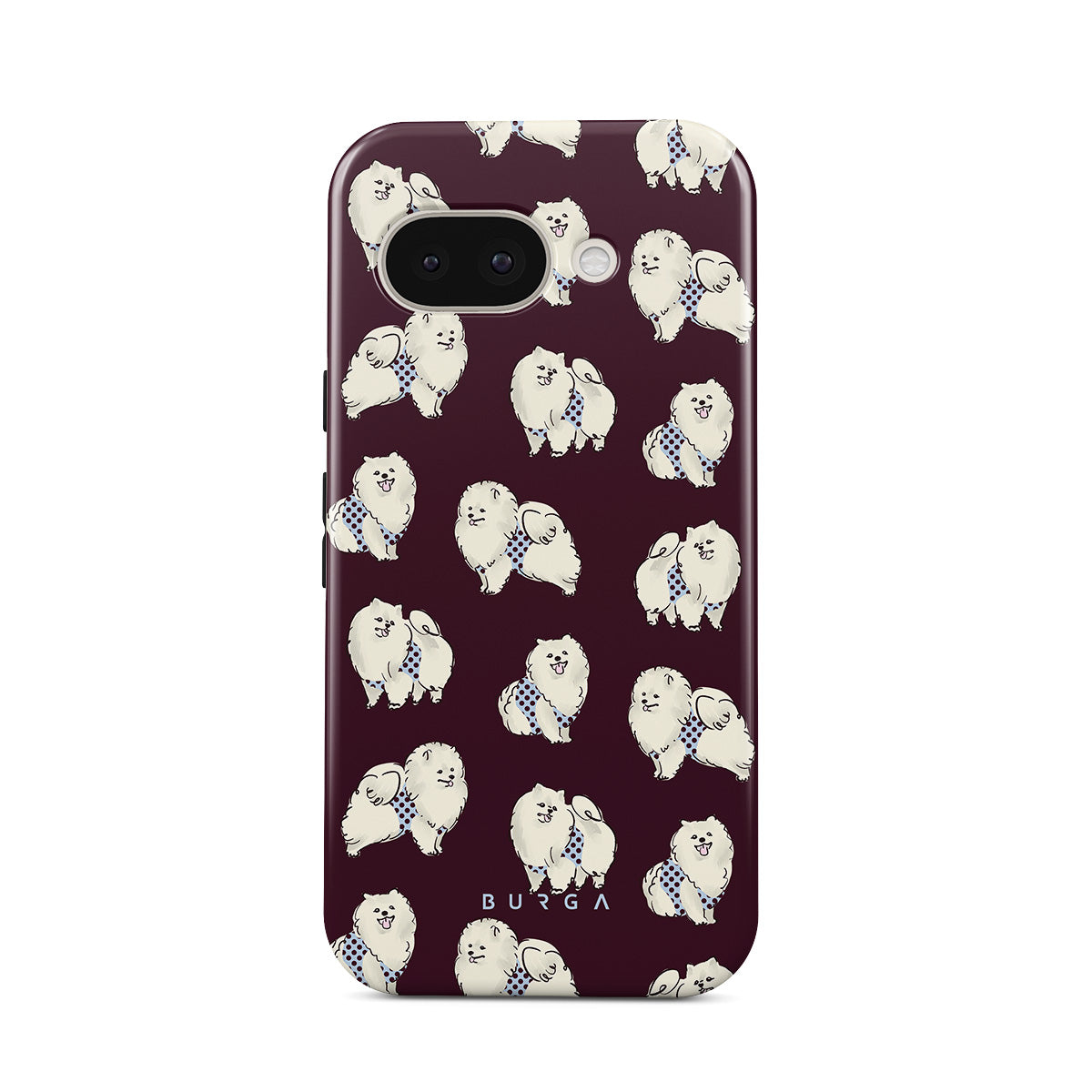 En este diseño: perros blancos y esponjosos, fondo burdeos oscuro, caniches, mascotas