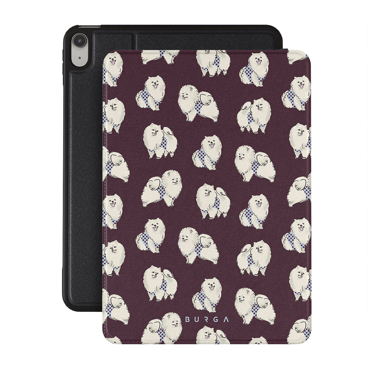 En este diseño: perros blancos y esponjosos, fondo burdeos oscuro, caniches, mascotas