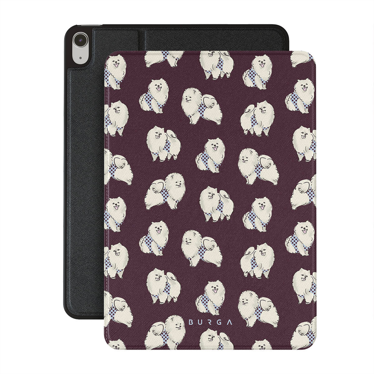 En este diseño: perros blancos y esponjosos, fondo burdeos oscuro, caniches, mascotas