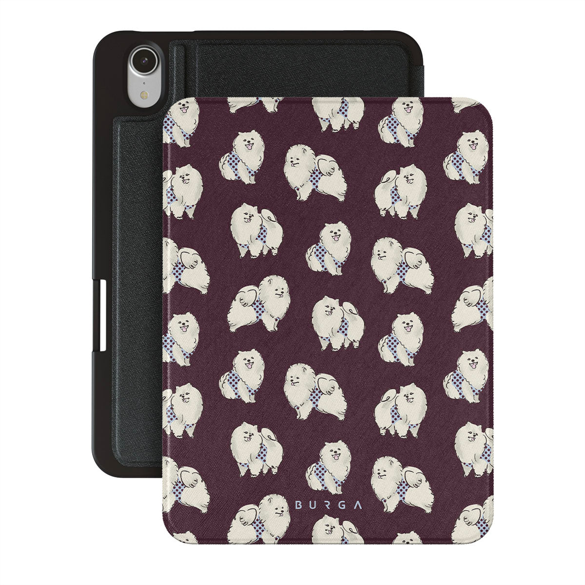 En este diseño: perros blancos y esponjosos, fondo burdeos oscuro, caniches, mascotas