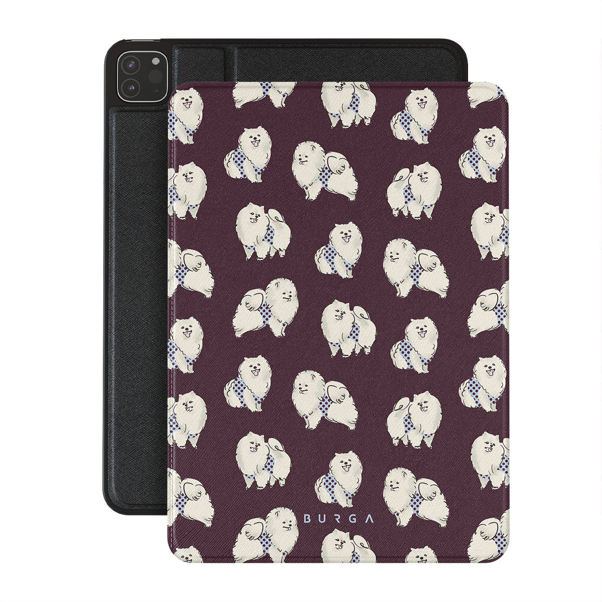 En este diseño: perros blancos y esponjosos, fondo burdeos oscuro, caniches, mascotas