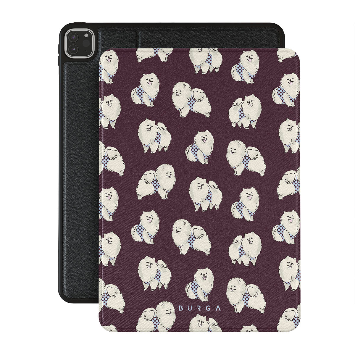 En este diseño: perros blancos y esponjosos, fondo burdeos oscuro, caniches, mascotas
