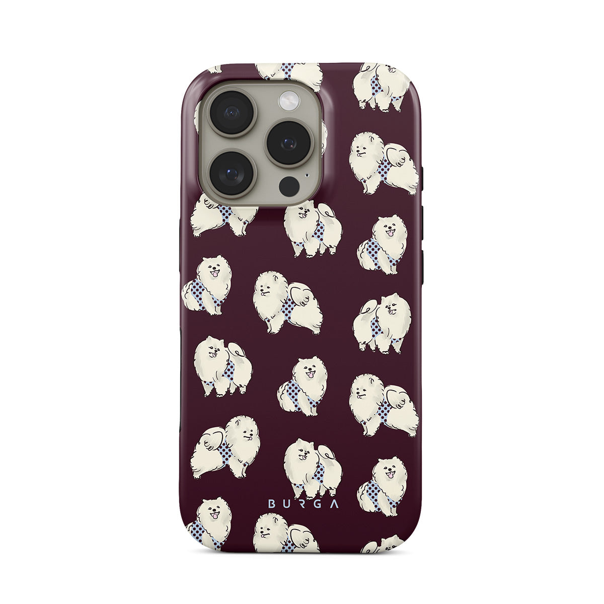 En este diseño: perros blancos y esponjosos, fondo burdeos oscuro, caniches, mascotas