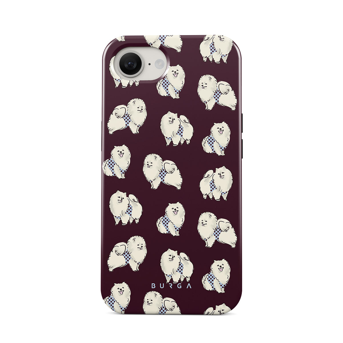 En este diseño: perros blancos y esponjosos, fondo burdeos oscuro, caniches, mascotas