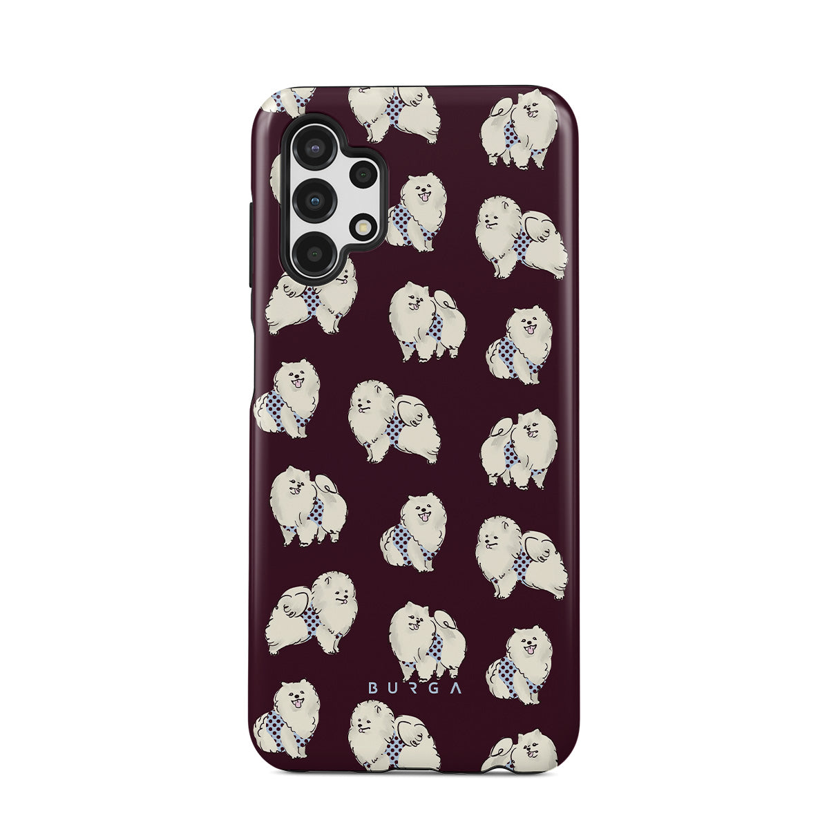 En este diseño: perros blancos y esponjosos, fondo burdeos oscuro, caniches, mascotas