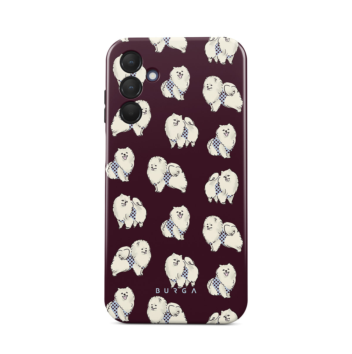 En este diseño: perros blancos y esponjosos, fondo burdeos oscuro, caniches, mascotas