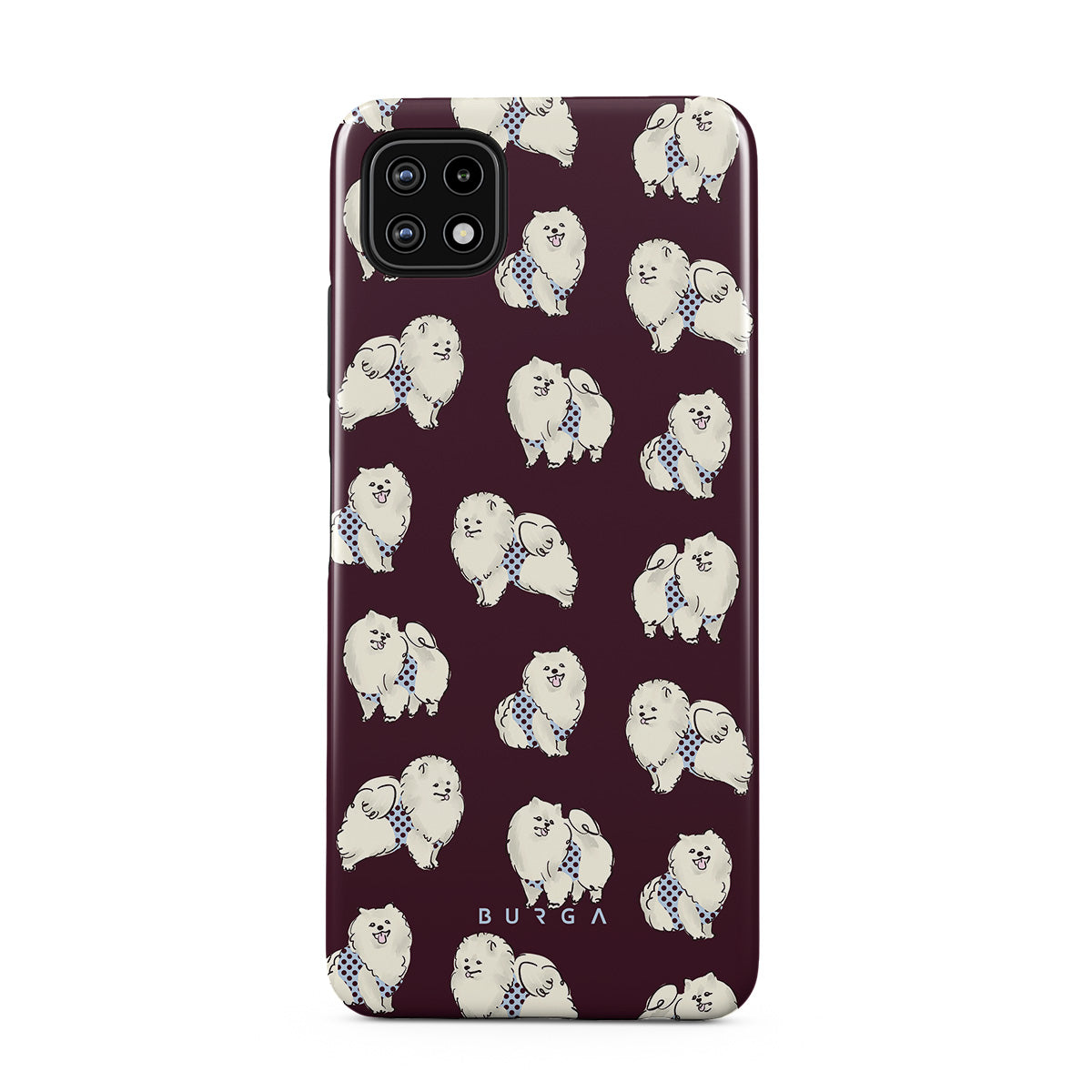 En este diseño: perros blancos y esponjosos, fondo burdeos oscuro, caniches, mascotas