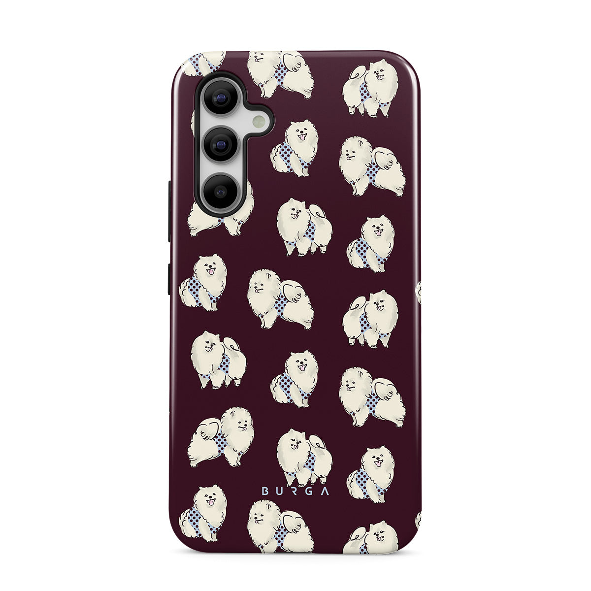 En este diseño: perros blancos y esponjosos, fondo burdeos oscuro, caniches, mascotas