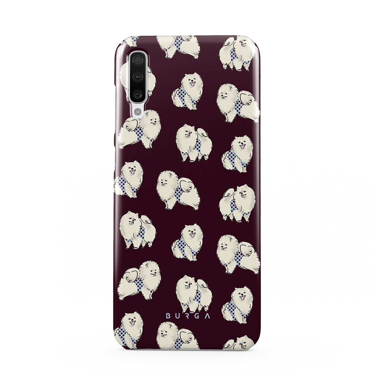 En este diseño: perros blancos y esponjosos, fondo burdeos oscuro, caniches, mascotas