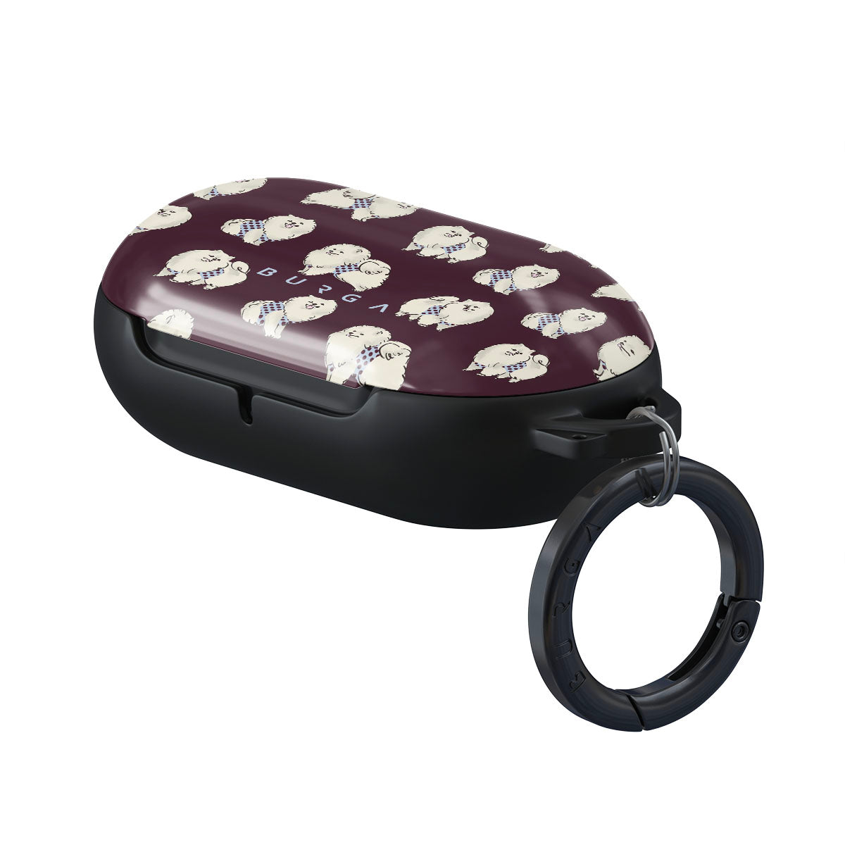En este diseño: perros blancos y esponjosos, fondo burdeos oscuro, caniches, mascotas